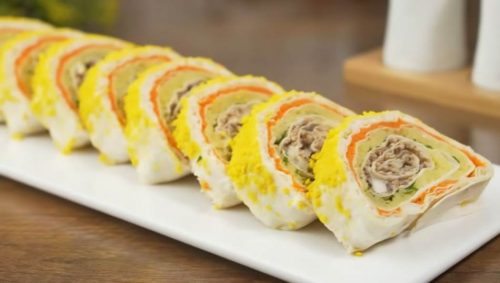 – Ako vam je lakše, možete da pomiješate sve sastojke za mimoza salatu, pa da tortilju premažete majonezom, a onda pospete salatom i urolate – savjet je kuvarice Oksane Paško.