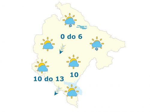 Danas će u Crnoj Gori biti umjereno do pretežno oblačno, ponegdje sa slabim padavinama, uglavnom u sjevernim predjelima. U popodnevnim satima u južnim predjelima postepeno razvedravanje. Vjetar tokom dana u skretanju na sjeverni i sjeveroistočni, krajem dana i tokom noći mjestimično umjeren do jak. Najviša dnevna temperatura vazduha od 0 do 13 stepeni, saopšteno je iz Zavoda za hidrometeorologiju.