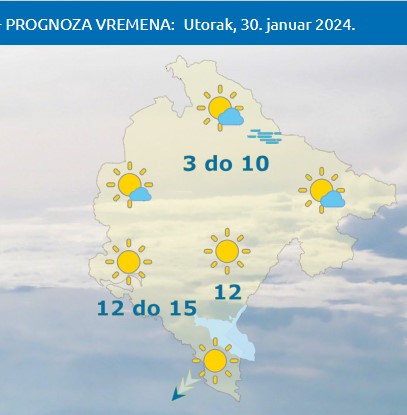Danas će u Crnoj Gori biti pretežno sunčano. Na sjeveru, ujutru jak mraz, a po kotlinama moguća magla ili niska oblačnost. Vjetar slab do umjeren promjenljivog smjera, prijepodne ponegdje umjeren sjeveroistočni. Najviša dnevna temperatura vazduha od 3 do 15 stepeni, saopšteno je iz Zavoda za hidrometeorologiju.