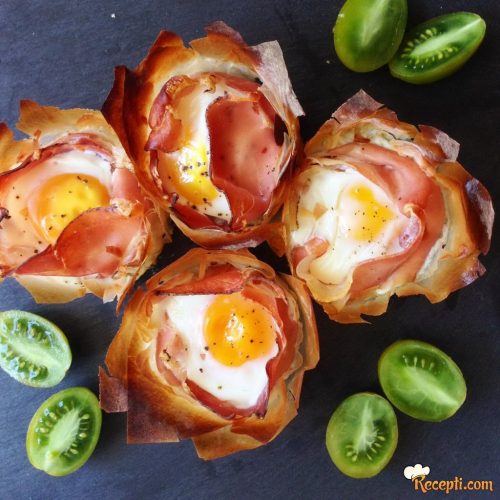 Kore isjeći na kvadrate, pa ih slagati u kalup za mafine koji smo prethodno dobro podmazali. Otprilike staviti četiri kvadrata u svaki kalup, zatim malo premazati uljem, pa staviti kašiku-dvije paradajz pelata ili kečapa. Pršutom ili slaninom obaviti stranice svakog kalupa, staviti u sredinu mocarelu ili narendani sir po želji, dodati malo origana i na kraju razbiti po jedno jaje. Peći nekoliko minuta u prethodno zagrijanoj rerni (Vrijeme pečenja zavisi od rerne i od toga kako volite kuvana jaja- mojoj rerni je trebalo manje od sedam minuta da bi jaja bila rovita, a deset minuta za tvrdo kuvana jaja, kaže kuvarica Milica Kolarov). Servirati sa salatom ili prilogom po želji. Prijatno!