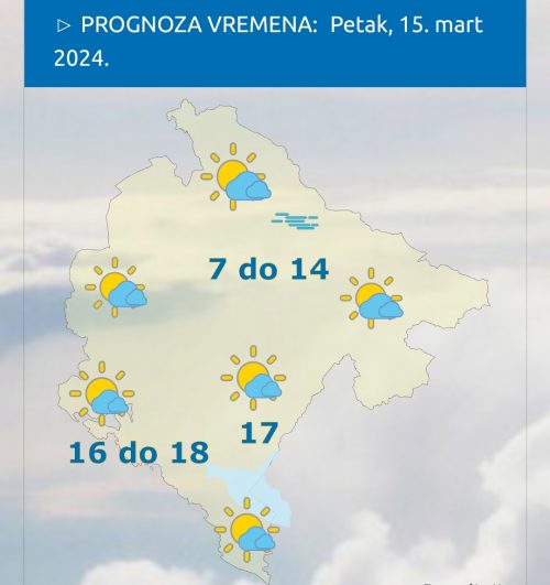 Danas će u Crnoj Gori biti promjenjivo oblačno, u južnim predjelima sa dužim sunčanim intervalima i uglavnom suvo. Na sjeveru, ujutru, po kotlinama magla ili povećana niska oblačnost. Vjetar uglavnom slab do umjeren, promjenjivog smjera. Najviša dnevna temperatura vazduha od 7 do 18 stepeni, saopšteno je iz Zavoda za hidrometeorologiju.