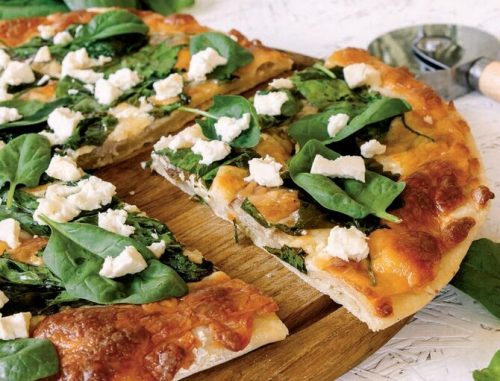 Za tijesto pomiješajte mlaku vodu, so, šećer i kvasac. Neprekidno miješajući, dodajte brašno. Tijesto ostavite da odstoji najmanje jedan sat, a nakon toga ga podijelite na četiri jufke i tanko rastanjite. Preko tijesta stavite obareni spanać, pasirani bijeli luk, a na kraju pospite rendanim sirom. Pecite desetak minuta na 250 stepeni. Kad se ispeče, pitu prelijte sa malo maslinovog ulja.