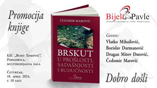 Promocija knjige ,,Brskut u prošlosti, sadašnjosti i budućnosti”, autora Čedomira Marovića, biće održana u četvrtak, 18. aprila u multimedijalnoj sali KIC-a ,,Budo Tomović” u Podgorici.