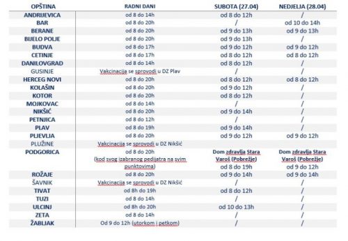 Institut za javno zdravlje Crne Gore pozvao je roditelje čija djeca nisu vakcinisana da ih dovedu na vakcinaciju u predviđenim terminima radnim danima, i u dodatnim terminima tokom vikenda, 27. i 28. aprila.