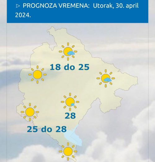 Danas će u Crnoj Gori biti pretežno sunčano. Tokom popodneva, na sjeveru slab do umjeren razvoj oblačnosti. Vjetar slab do umjeren, promjenjivog smjera, tokom jutra ili prijepodneva u istočnom dijelu zemlje ponegdje pojačan, sjeveroistočni. Najviša dnevna temperatura vazduha od 18 do 28 stepeni, saopšteno je iz Zavoda za hidrometeorologiju.