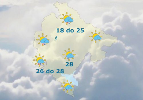 U Crnoj Gori danas će biti promjenljivo oblačno, tokom jutra ili prijepodneva mjestimično kiša ili pljusak i grmljavina. Od sredine dana duži sunčani intervali, još ponegdje uslijed jačeg razvoja oblaka, moguć je izolovani pljusak. Vjetar slab do umjeren, mjestimično i pojačan, na udare jak, južnih smjerova. Najviša dnevna temperatura vazduha od 18 do 29 stepeni, kazali su iz Zavoda za hidrometeorologiju.