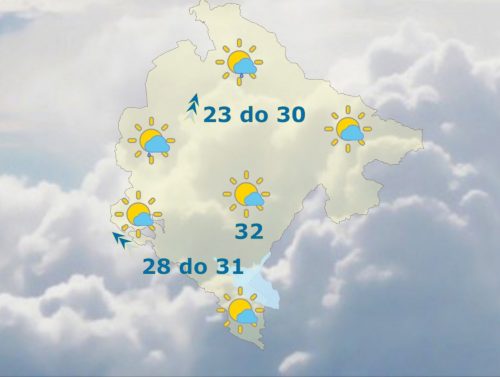 U Crnoj Gori danas će biti tokom jutra ili prijepodneva promjenljivo oblačno, ponegdje kiša ili pljusak i grmljavina, prvenstveno u zapadnom dijelu zemlje, a u drugom dijelu dana pretežno sunčano ponegdje uz malu do umjerenu oblačnost. Vjetar mjestimično umjeren do pojačan, na udare ponegdje jak, južnih smjerova. Najviša dnevna temperatura vazduha od 23 do 33 stepena, kazali su iz Zavoda za hidrometeorologiju.
