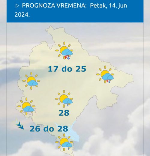 Sjutra će u Crnoj Gori biti pretežno sunčano. Na sjeveru, ujutru, po kotlinama moguća magla a u popodnevnim satima ponegdje malo do umjereno oblačno. Vjetar slab do umjeren, promjenljivog smjera. Jutarnja temperatura vazduha od 7 do 18, najviša dnevna od 23 do 29 stepeni.