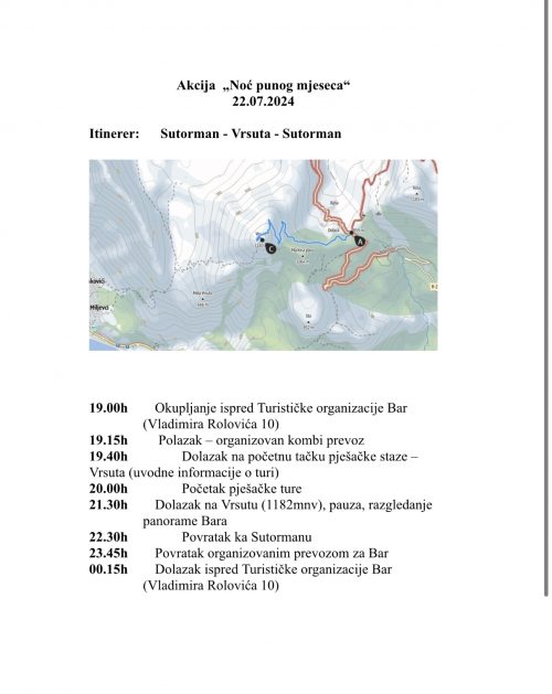 Okupljanje učesnika planirano je ispred Turističke organizacije Bar u 19h, odakle će biti organizovan autobuski prevoz. Tura će trajati oko pet sati, a predviđena je za sve ljubitelje prirode, rekreativce i one koji žele doživjeti noćni ugođaj pod svjetlošću punog mjeseca.