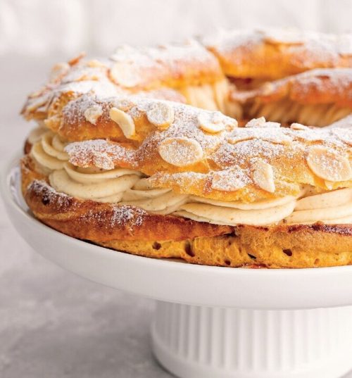 Razbijte jaja i pazite da ih bude tačno po mjeri. Vodu, ulje, šećer i so stavite da provri, pa sklonite s vatre i umiješajte brašno. Vratite na ringlu i kuvajte tijesto dok ne dobijete kompaktnu grudvu. Kada se tijesto malo prohladi, postepeno umiješajte jaja i mutite dok ne dobijete elastično, glatko tijesto. Tijestom napunite dresir kesu i na plehu obloženom pek-papirom oblikujte širi i veći krug. Tijesto premažite razmućenim jajetom i pospite bademima. Pecite oko 35 minuta na 200 stepeni. U tiganju propecite lješnike, skinite im ljuskicu, ubacite u karamelizovani šećer i izlijte na pek-papir. Kada se ohladi, sameljite u blenderu i dobijenu pastu odložite u frižider.