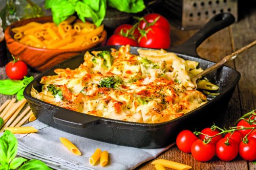 Skuvajte tjesteninu prema uputstvu sa kesice. Očistite i usitnite povrće. Brokoli iscjepkajte na cvjetove, šargarepu, tikvice i paradajz isijecite na kolutove. Brokoli blanširajte oko tri minuta i procijedite ga. Isjeckajte luk, prodinstajte ga na maslacu, pa ubacite šargarepu, dolijte malo vode i ostavite da se krčka pet minuta. Sjedinite povrće i pastu, sipajte sve u nauljeni pleh i prelijte smjesom koju ste napravili od jaja, mlijeka, 50 g sira, malo soli i bibera. Odozgo pospite preostalim sirom i pecite u zagrijanoj rerni na 200 stepeni oko 30 minuta.