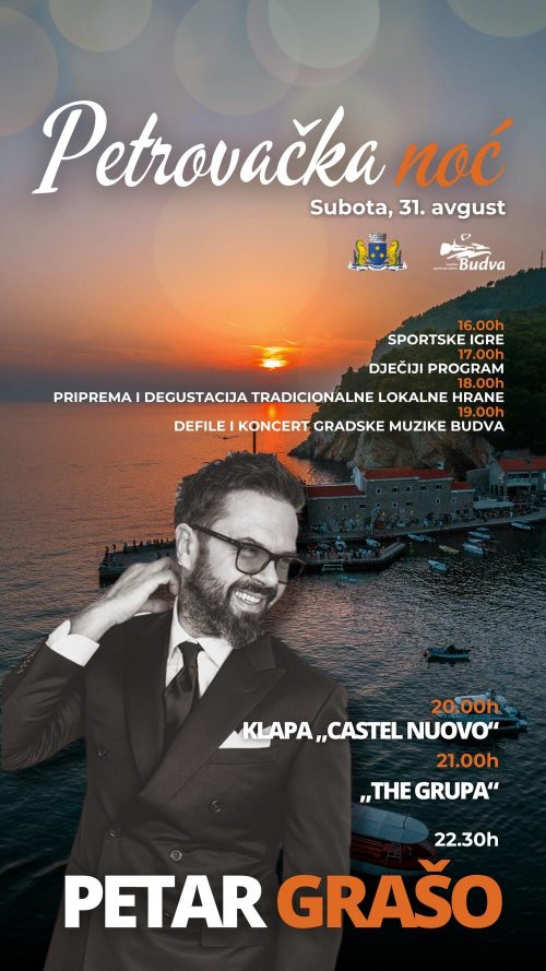Na glavnoj bini na šetalištu ispred hotela “Palas”, kako se dodaje, program će početi nastupom primorskog pop-rock benda “The Grupa” u 21 čas, a u 22.30 časova slijedi nastup zvijezde ovogodišnje Petrovačke noći, Petra Graša.
