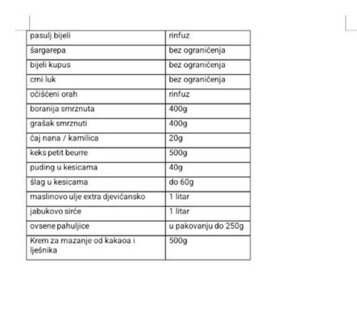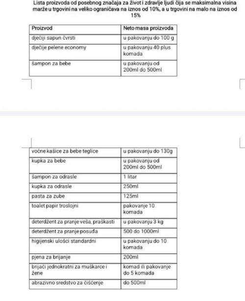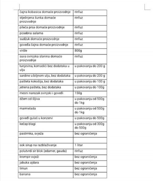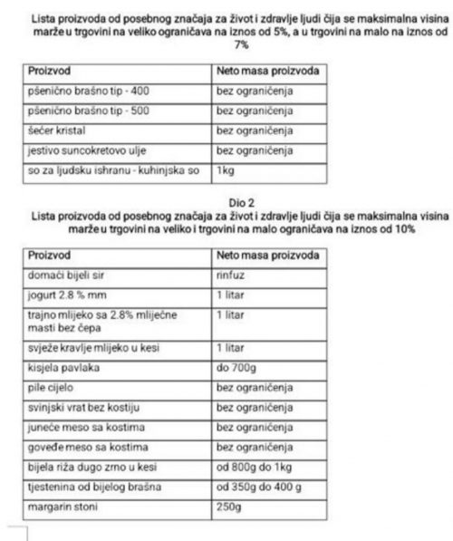 Odlučeno je da marže budu ograničene na 10 odsto na mliječne proizvode, svježe meso i ribu, određene šunke i kobasice, paštete, pirinač, tjesteninu, krompir, jabuke, limun, banane, pasulj, šargarepu, kupus, luk, džemove i marmelade i još neke proizvode.