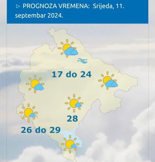 Sjutra će u Crnoj Gori na jugu biti pretežno sunčano, uz povremeno malu ili umjerenu oblačnost. Na sjeveru promjenjivo oblačno sa sunčanim intervalima i uglavnom suvo, u jutarnjim satima po kotlinama magla ili povećana niska oblačnost. Vjetar u jutarnjim satima, mjestimično umjeren do pojačan, sjevernih smjerova, tokom dana će oslabiti. Jutarnja temperatura vazduha od 7 do 20, najviša dnevna od 17 do 29 stepeni, saopšteno je iz Zavoda za hidrometeorologiju Crne Gore.