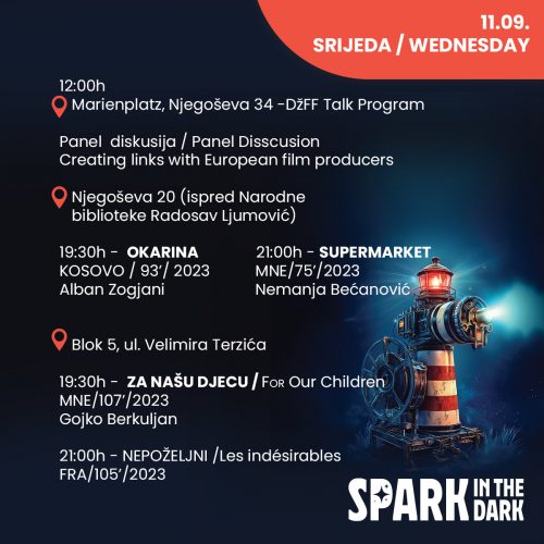 Ispred biblioteke ,,Radosav Ljumović” sa početkom u 19.30 prikazaće se večeras takmičarski film ,,OKARINA” kosovskog reditelja Albana Zogjanija, a od 21 h prikazuje se film ,,Supermarket”, Nemanje Bećanovića.