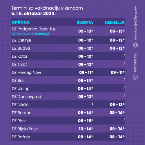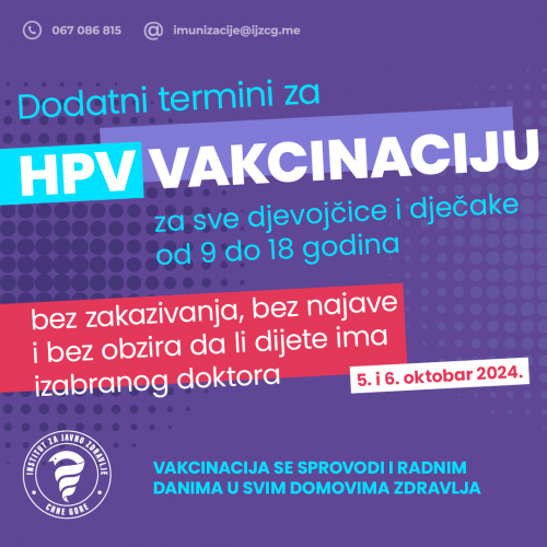 Institut za javno zdravlje Crne Gore zajedno sa domovima zdravlja nastavlja jesenju kampanju vakcinacije protiv HPV infekcija i ovog vikenda.