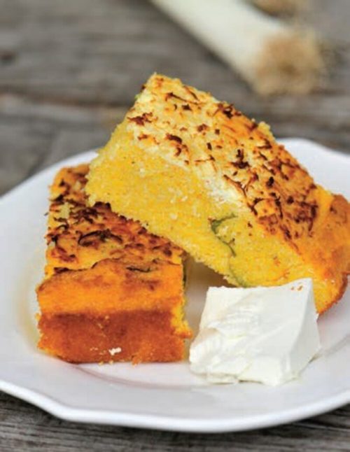 Umutite jaja i mlijeko, pa lagano dodajte brašno pomiješano s praškom za pecivo, palentu i griz. U smjesu stavite sir i sjeckani proprženi praziluk. Namastite pleh, pa izlijte smjesu. Pitu pecite oko 35 minuta u rerni zagrijanoj na 200 stepeni.