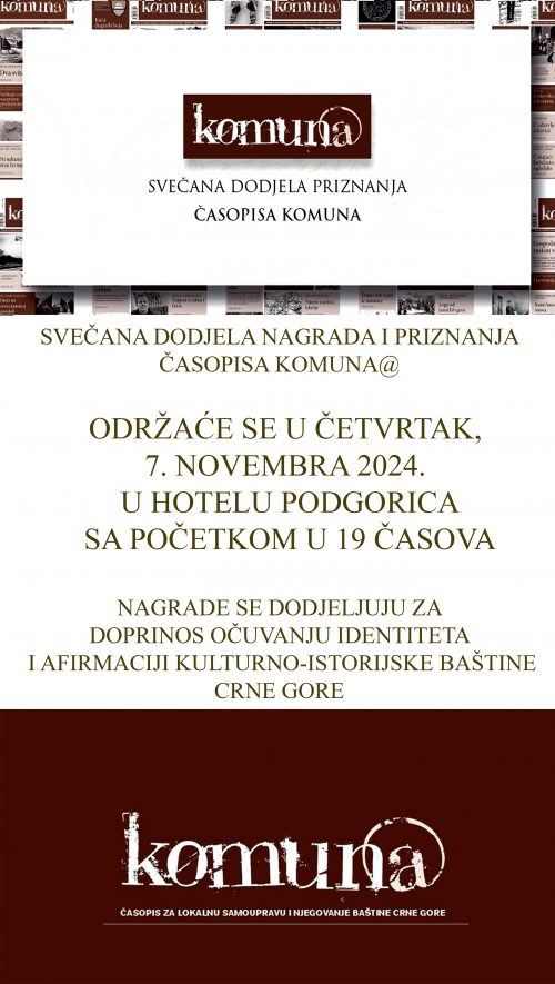 Svečano uručenje nagrada časopisa Komun@ za 2023. godinu, koje se dodjeljuju za doprinos očuvanju identiteta i afirmacije kulturno- istorijske baštine Crne Gore, biće održano u četvrtak, 7. novembra, u 19 sati u Hotelu Podgorica, saopšteno je iz Redakcije, uredništva i Programskog odbora časopisa KOMUN@.