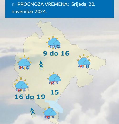 Danas će u Crnoj Gori biti pretežno oblačno, povremeno kiša, pljuskovi i grmljavina, znatno češće, u drugom dijelu dana i tokom noći. U večernjim satima, na sjeveru, uslijed naglog pada temperature vazduha kiša će preći u snijeg. Krajem dana i tokom noći se mjestimično očekuju umjerene do obilne količine kiše, a na sjeveru i snijega. Vjetar umjeren do jak, na udare i veoma jak, ponegdje i olujne jačine, južnih smjerova. Najviša dnevna temperatura vazduha od 9 do 19 stepeni, saopšteno je iz Zavoda za hidrometeorologiju.