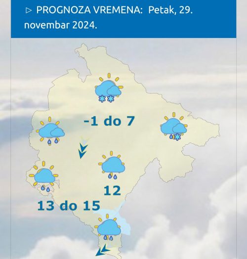Sjutra će u Crnoj Gori biti umjereno do potpuno oblačno, povremeno kiša, ponegdje pljuskovi, moguća i grmljavina. Na sjeveru, prvo u višim predjelima, već tokom jutra snijeg i susnježica koji će se tokom dana proširiti i na ostale predjele. Ponegdje se očekuju intenzivnije padavine. U popodnevnim satima ili krajem dana postepen prestanak padavina. Vjetar uglavnom slab do umjeren sjevernih smjerova, od sredine dana umjeren do pojačan, na udare ponegdje jak. Jutarnja temperatura vazduha od minus tri do 13, najviša dnevna od minus jedan do 15 stepeni, saopšteno je iz Zavoda za hidrometeorologiju Crne Gore.
