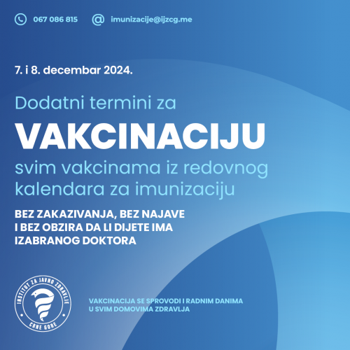 Institut za javno zdravlje Crne Gore i domovi zdravlja nastavljaju kampanju vakcinacije svim vakcinama iz redovnog kalendara imunizacije. Vakcinacija se obavlja radnim danima direktno u dogovoru sa timovima izabranih doktora za djecu, a vikendima mogu doći sva djeca, bez obzira da li su direktno pozvani i da li imaju izabranog doktora, saopšteno je iz PR službe IJZCG.
