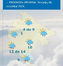 Ujutru na sjeveru po kotlinama moguća magla. Vjetar južni i jugoistočni mjestimično umjeren do jak. Jutarnja temperatura vazduha od minus osam do deset, najviša dnevna od četiri do 14 stepeni.
