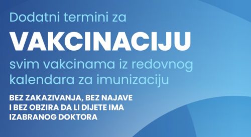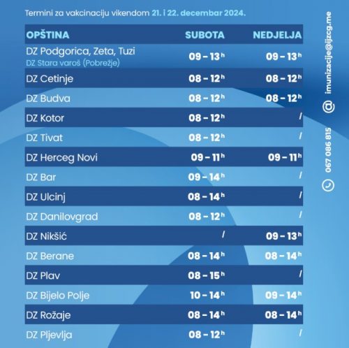 Institut za javno zdravlje Crne Gore i domovi zdravlja predstojeće subote i nedjelje (21. i 22. decembar) organizuju vakcinaciju svim vakcinama iz redovnog kalendara u dodatnim terminima.