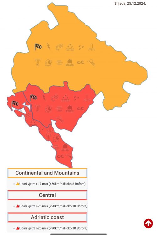 Za primorje i centralni dio Crne Gore za sjutra je izdat crveni meteoalarm zbog snažnog vjetra, čiji će udari ponegdje biti olujne i orkanske jačine, a čija će brzina dostizati i preko 90 kilometara na čas.