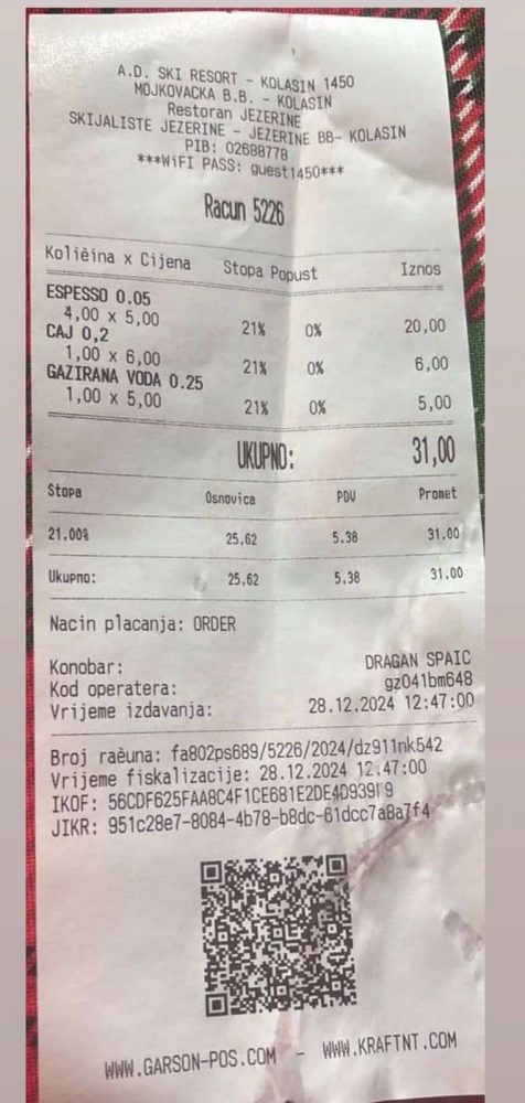 Skijaška sezona u popularnom crnogorskom skijalištu, Kolašin 1450 na Bjelasici počela je prije par dana, a cijene u restoranu koji se nalazi u sklopu ovog kompleksa poprilično su velike.