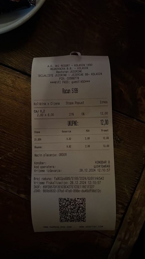Na drugoj fotografiji koja je dostavljena, takođe se vidi račun iz istog restorana, gdje su dva čaja plaćena 12 eura.