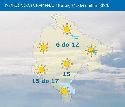 – Za novogodišnju noć vedro i uglavnom tiho, a po kotlinama postepeno formiranje magle ili sumaglice. Temperatura vazduha postepeno u padu, a na samom početku Nove godine u južnim predjelima od pet do deset, a na sjeveru od minus četiri do nula stepeni – navodi se u vremenskoj prognozi ZHMSCG koju potpisuje Vučina Popović.