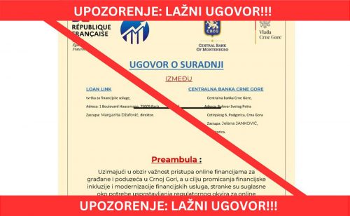 Centralna banka Crne Gore upozorava da su se u javnosti pojavile lažne informacije i ponude, kojima se na osnovu navodnog ugovora o saradnji između Loan Link i CBCG omogućava davanje online kredita u Crnoj Gori, saopšteno je iz Centralne banke Crne Gore.