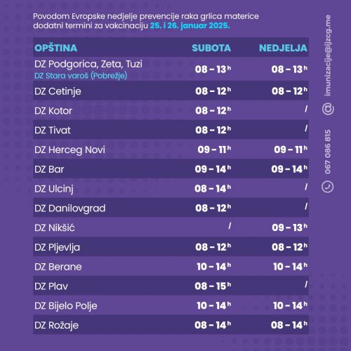 Institut za javno zdravlje Crne Gore (IJZCG) i domovi zdravlja, predstojeće subote i nedjelje (25. i 26. decembar), povodom Evropske nedjelje prevencije raka grlića materice organizuju HPV vakcinaciju u dodatnim terminima, saopšteno je iz Instituta.