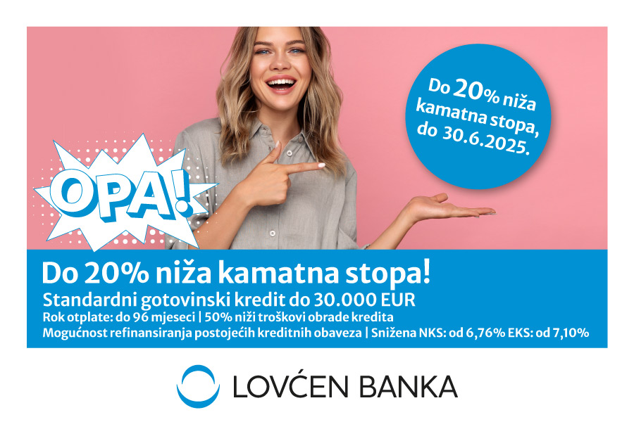 Lovćen banka ponudila je Standardni gotovinski kredit po sniženoj kamatnoj stopi čak i do 20%, uz 50% popusta na iznos administrativne naknade za odobrenje kredita.