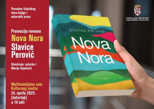 JU Kulturni centar „Nikola Đurković“ / Gradska biblioteka i čitaonica Kotor, povodom Svjetskog dana knjige i autorskih prava, u četvrtak 24. aprila organizuje promociju novog romana Slavice Perović „Nova Nora“. Sa autorkom će razgovarati pjesnikinja Marija Vujošević, saopšteno je iz PR službe JU Kulturni centar ,,Nikola Đurković”