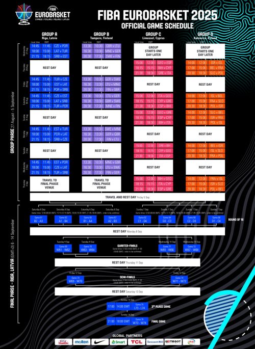Objavljen je raspored utakmica u prvoj fazi Eurobasketa koji se ove godine, od 27. avgusta do 14. septembra igra na četiri lokacije – Letonija, Poljska, Kipar i Finska.