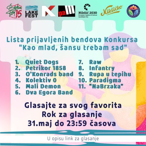 Za drugu sezonu Konkursa za mlade bendove ,,Kao mlad, šansu trebam sad” pristiglo je ukupno 11 prijava a prijavljeni bendovi su: Raw, O'Konrads, Petrikor, Nabrzaka, Quiet Dogs, Paradigma, Kolektiv 0, Infantry, Dva Egora Band, Mali Demon i Rupa u tepihu, navodi se u zajedničkom saopštenju Bedem festa i Lake festa.