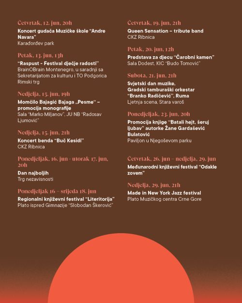 Junski program donosi i brojne zanimljive i popularne događaje, među kojima su koncerti talentovanih učenika Muzičke škole ,,Andre Navara”, povodom Svjetskog dana muzike gostovanje Gradskog tamburaškog orkestra ,,Branko Radičević” iz Rume, biće priređeni koncerti bendova Queen Sensation i Buč Kesidi u CKZ Ribnica; autorsko veče književnika Aleksandra Gatalice, promocija monografije Momčila Bajagića Bajage – “Pesme”, kao i promocija knjige ,,Batali hejt, šeruj ljubav”, autorke Žane Gardašević Bulatović. Zastupljeni su i tradicionalni festivali: Rockstrikcija, Underhill, ,,Raspust – Festival dječje radosti” (u saradnji sa BrainOBrain Montenegro i TO Podgorica), Regionalni književni festival ,,LiTeritorija”, Međunarodni književni festival ,,Odakle zovem”, kao i Made In New York Jazz festival.