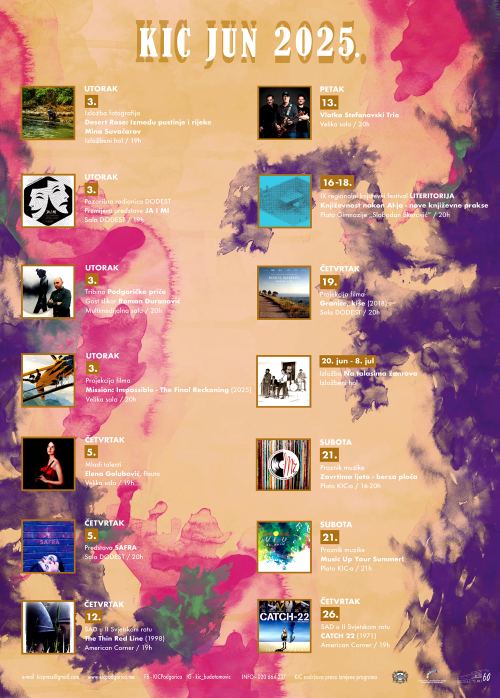 Likovni program KIC-a nastaviće da promoviše raznovrsnost vizuelnih izraza, pa će publika od 20. juna do 8. jula biti u prilici da pogleda izložbu „Na talasima žanrova” posvećenu različitim muzičkim žanrovima. Riječ je postavci koja pruža uvid u višedecenijsku muzičku arhivu i umjetnički razvoj naše ustanove. U KIC-u će 3. juna biti otvorena i izložba fotografija „Desert Rose: Između pustinje i rijeke” Mine Suvačarov koja reflektuje autorkinu posvećenost fotografiji kao umjetničkoj formi.