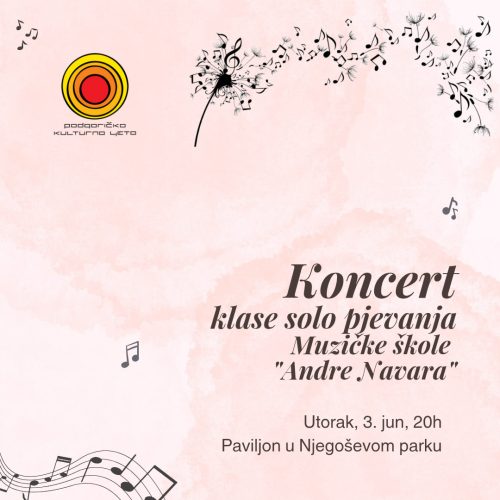 U utorak, 3. juna, u 20 sati, u Paviljonu u Njegoševom parku biće priređen koncert klase solo pjevanja Umjetničke škole za osnovno i srednje muzičko obrazovanje ,,Andre Navara”, saopšteno je iz PR službe Sekretarijata za kulturu Glavnog grada.