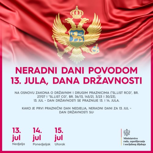 Na osnovu Zakona o državnim i drugim praznicima, Dan državnosti se praznuje 13. i 14. jula. Međutim, kako je prvi praznični dan nedjelja, neradni dani su nedjelja 13. jul, ponedjeljak 14. jul i utorak 15. jul, saopšteno je iz Ministarstva rada, zapošljavanja i socijalnog dijaloga.
