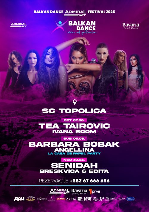 Od 7. do 10. avgusta, Bar postaje epicentar muzičke zabave! Balkan Dance AdmiralBet Festival donosi tri nezaboravne noći nastupa najvećih regionalnih zvijezda, atmosferu za pamćenje i ritmove koji će podići publiku na noge.