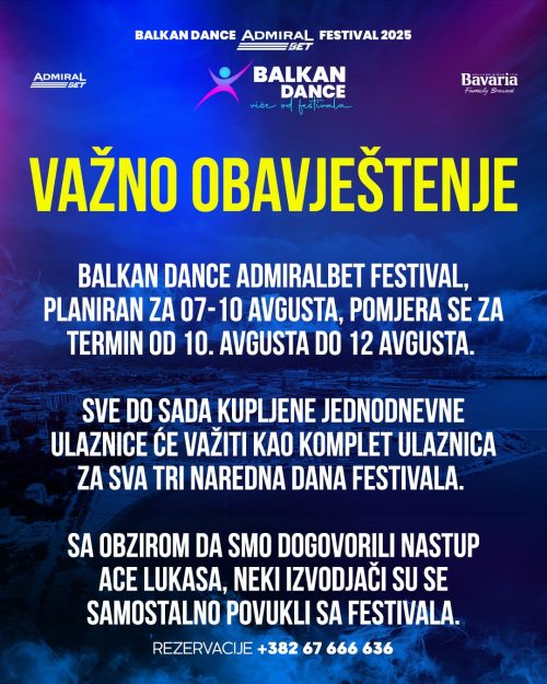 Balkan Dance AdmiralBet Festival donosi spektakl ljeta – ali u novom ruhu! Zbog tehničkih izmjena i proširenja produkcije, festival se pomjera na nove datume: od 10. do 12. avgusta, a sve se sada dešava na novoj, većoj i atraktivnijoj lokaciji – Bar Topolica (Nova Bartopolica).