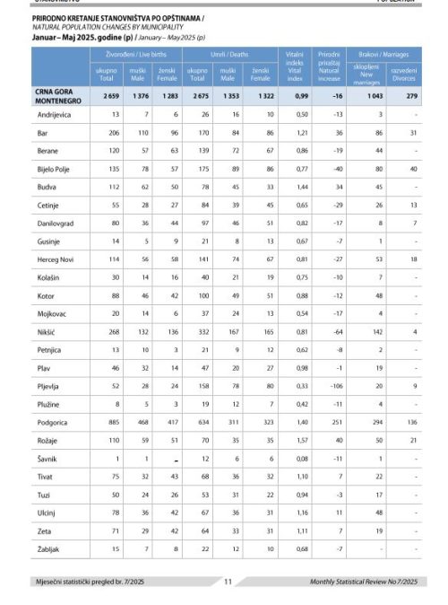 Crna Gora se i u 2025. godini suočava s nastavkom negativnih demografskih trendova. Prema najnovijim podacima Uprave za statistiku (MONSTAT), od 1. januara do 31. maja rođeno je 2.659 beba, dok je preminulo 2.675 osoba, što znači da je prirodni priraštaj negativan i iznosi -16.