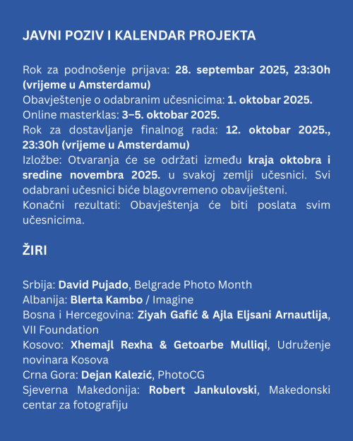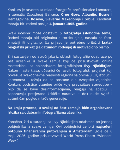 - osvoje potpuno finansirano putovanje u Amsterdam tokom manifestacije World Press Photo Winners’ Week 2026.