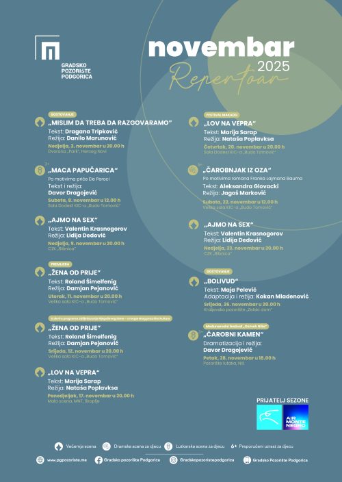 Pored premijere, publika u Podgorici imaće priliku da, u subotu, 8. novembra, u sali Dodest KIC-a „Budo Tomović“ od 12 sati pogleda i predstavu sa Lutkarske scene za djecu „Maca Papučarica“ (3+), koju je po tekstu Ele Peroci režirao Davor Dragojević. Dramska scena za djecu donosi predstavu „Čarobnjak iz Oza“ (5+), po motivima romana Franka Lajmana Bauma, u tekstu Aleksandre Glovacki i režiji Jagoša Markovića, subotu, 22. novembra, u Velikoj sali KIC-a „Budo Tomović“, takođe od 12 sati.