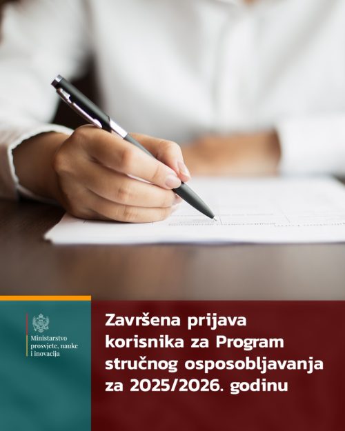 Rok za prijavljivanje potencijalnih korisnika Programa stručnog osposobljavanja lica sa stečenim visokim obrazovanjem istekao je danas, 18. novembra 2025. godine, u 12 sati, saopšteno je iz PR službe Ministarstva prosvjete, nauke i inovacija Crne Gore.