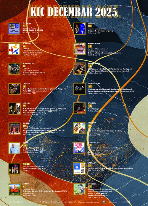 – U saradnji sa Mrežom kinoprikazivača Crne Gore 22. decembra prikazaćemo dokumentarni film „Čovjek lavina“, posvećen legendarnom bubnjaru Dragoljubu Đuričiću, a na repertoaru 25. decembra biće i dokumentarno filmsko ostvarenje ,,Vude, ti si pobijedio” reditelja Senada Šahmanovića o jedinom jugoslovenskom dobitniku Oskara Dušanu Vukotiću – najavljuju u KIC-u.