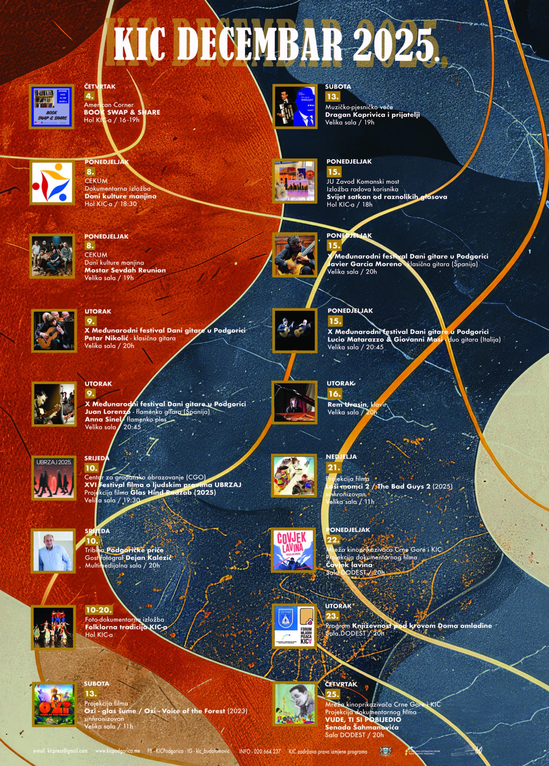 Brojni programi koji afirmišu raznovrsnost i bogatstvo savremenog umjetničkog izraza biće dio decembarskog repertoara Kulturno – informativnog centra „Budo Tomović”, saopšteno je iz PR službe KIC-a.