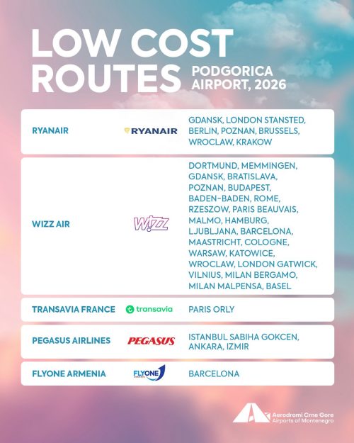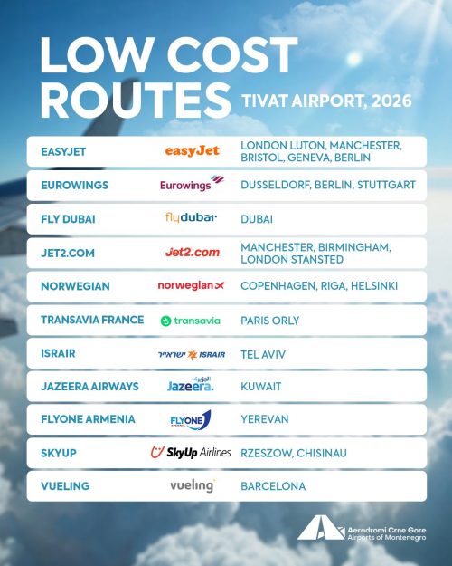 Niskotarifni (low-cost i OW-cost) prevoznici će tokom ljeta povezivati crnogorske aerodrome sa brojnim evropskim gradovima, omogućavajući putovanja po znatno nižim cijenama u odnosu na tradicionalne avio-linije, navodi se u saopštenju ACG.